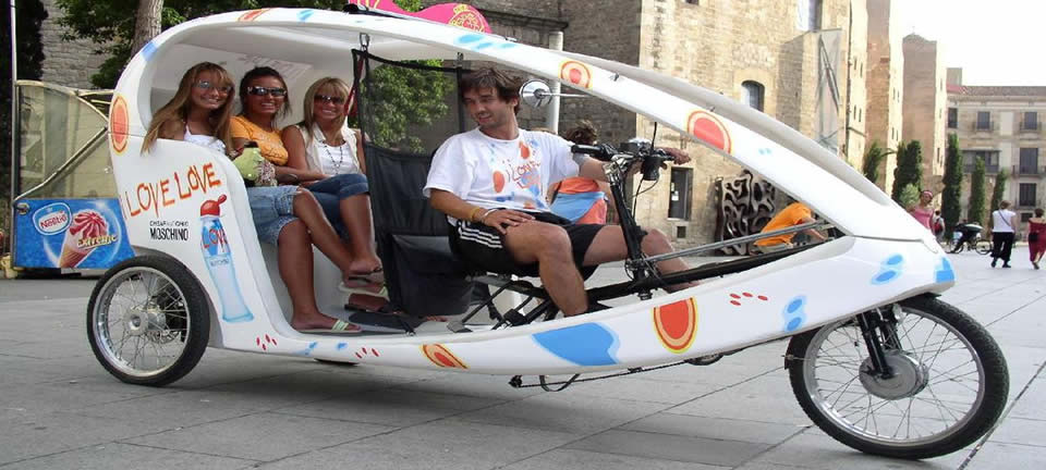 El bicitaxi (conocido también como rickshaw, tricitaxi, pedicab o velotaxi) es un vehículo destinado al marketing y transporte de pasajeros y construido bajo el principio de la bicicleta, accionado con tracción humana, con una capacidad de dos pasajeros adultos sentados y su conductor.
